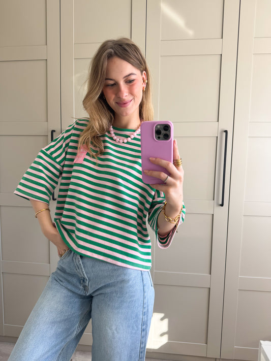 UitverkochtOversized T-shirt | Stripes | Matcha lichtroze