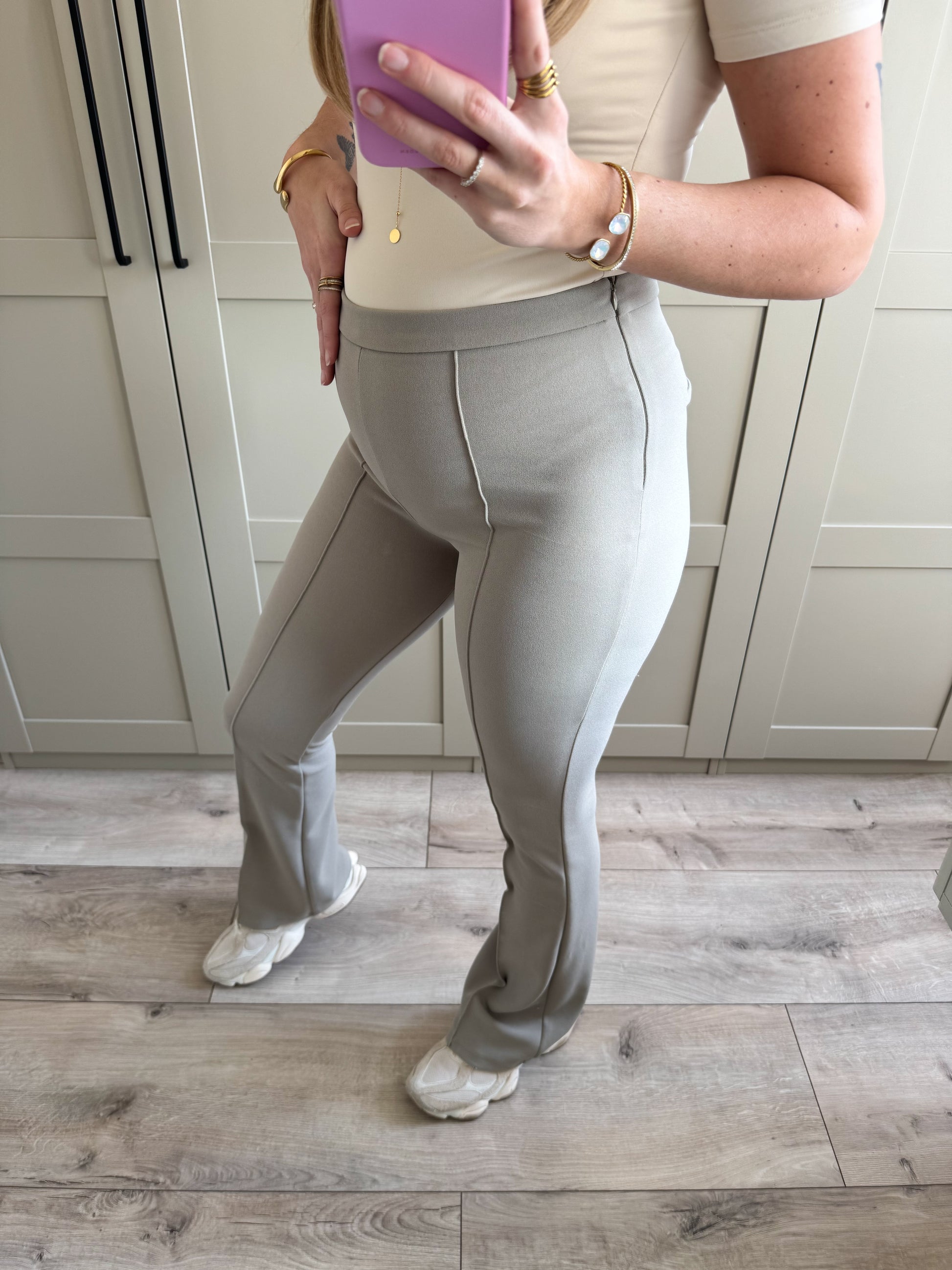 Deze flare broek bevat veel stretch en is highwaist. De broek is daarom ook preggy proof!