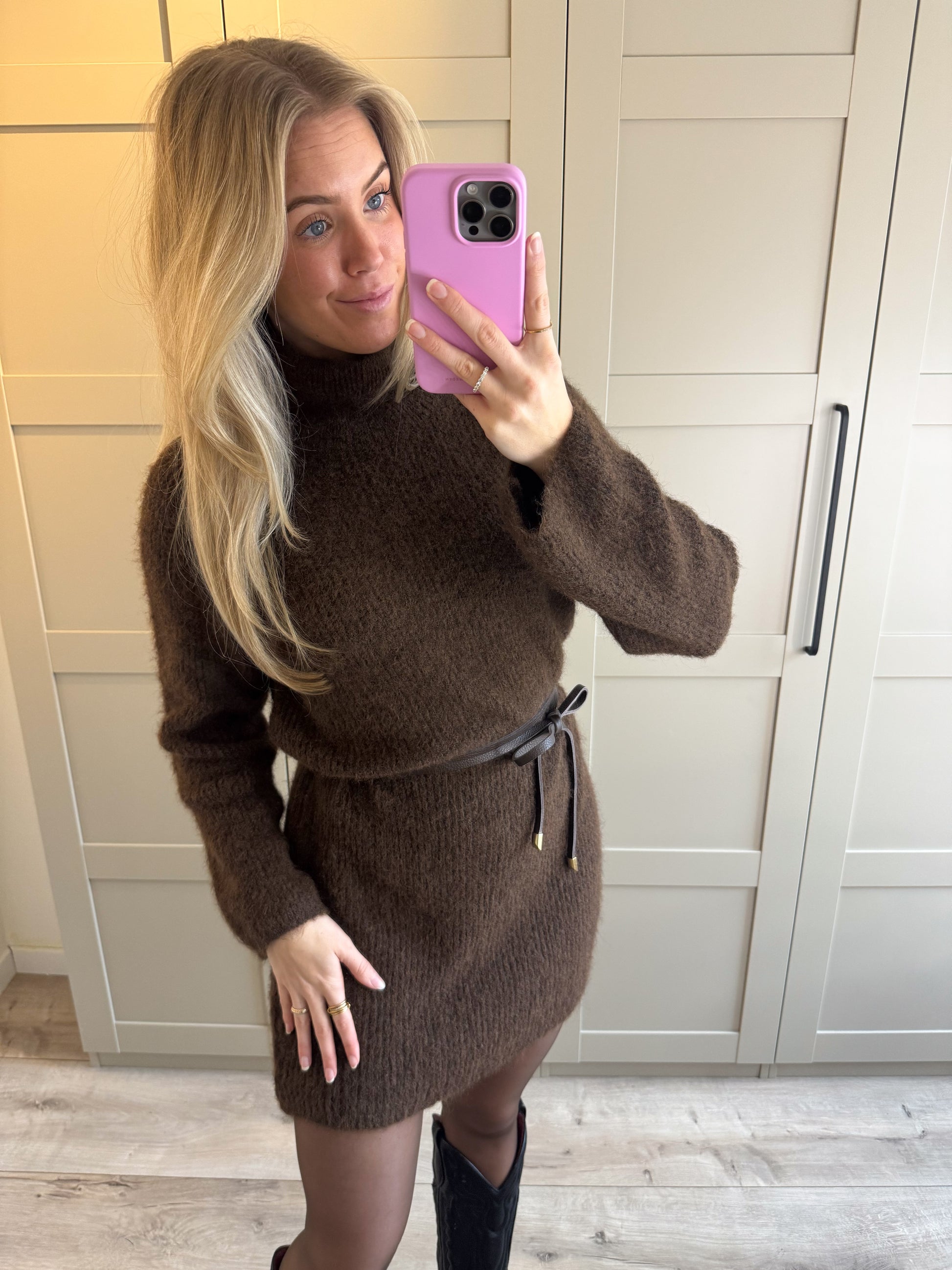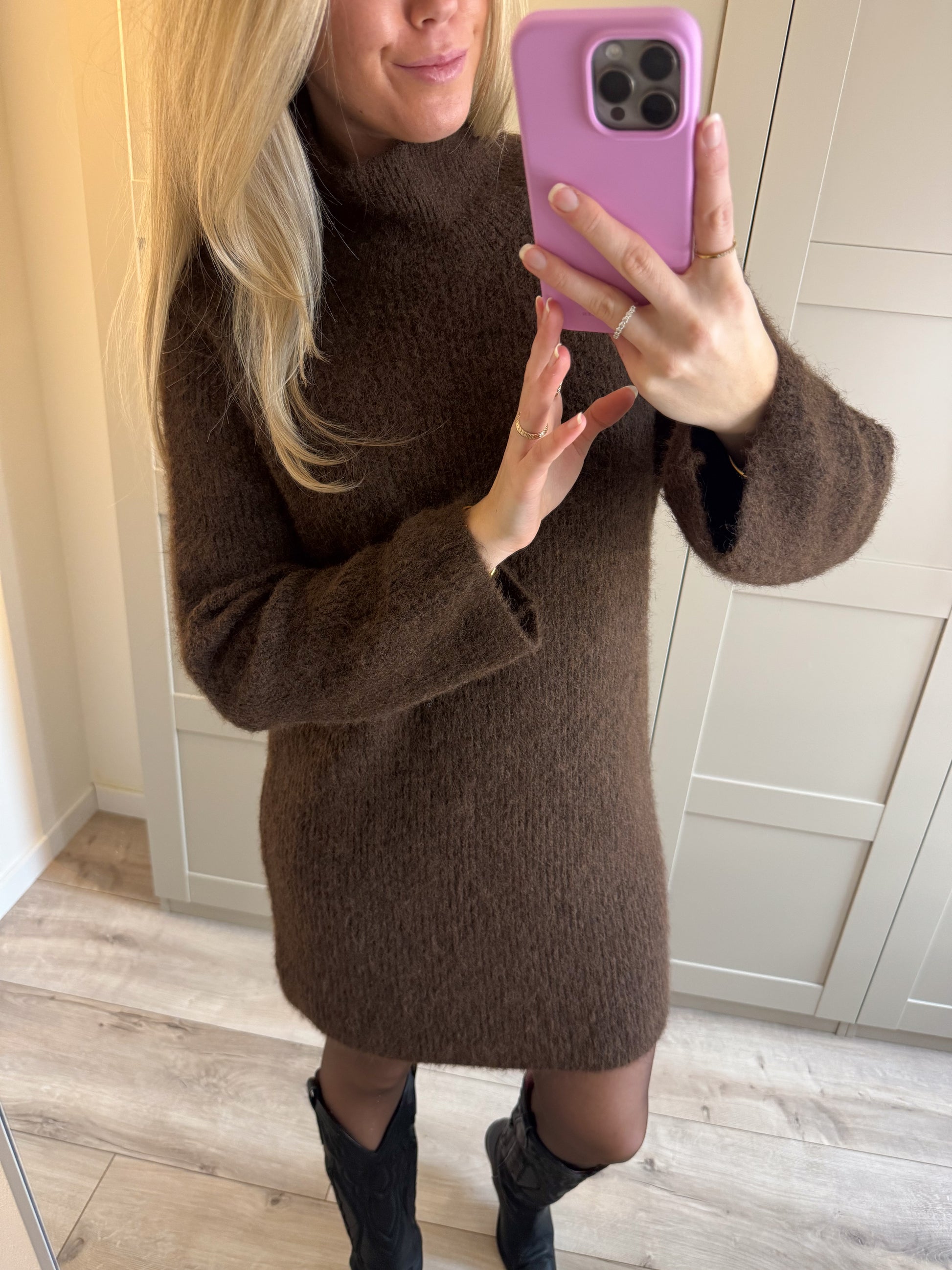 Jurk Mila is een gebreide, wijde jurk met een hoge opstaande hals en wijd uitlopende mouwen. Te leuk af te stylen met onze lucia riemen!