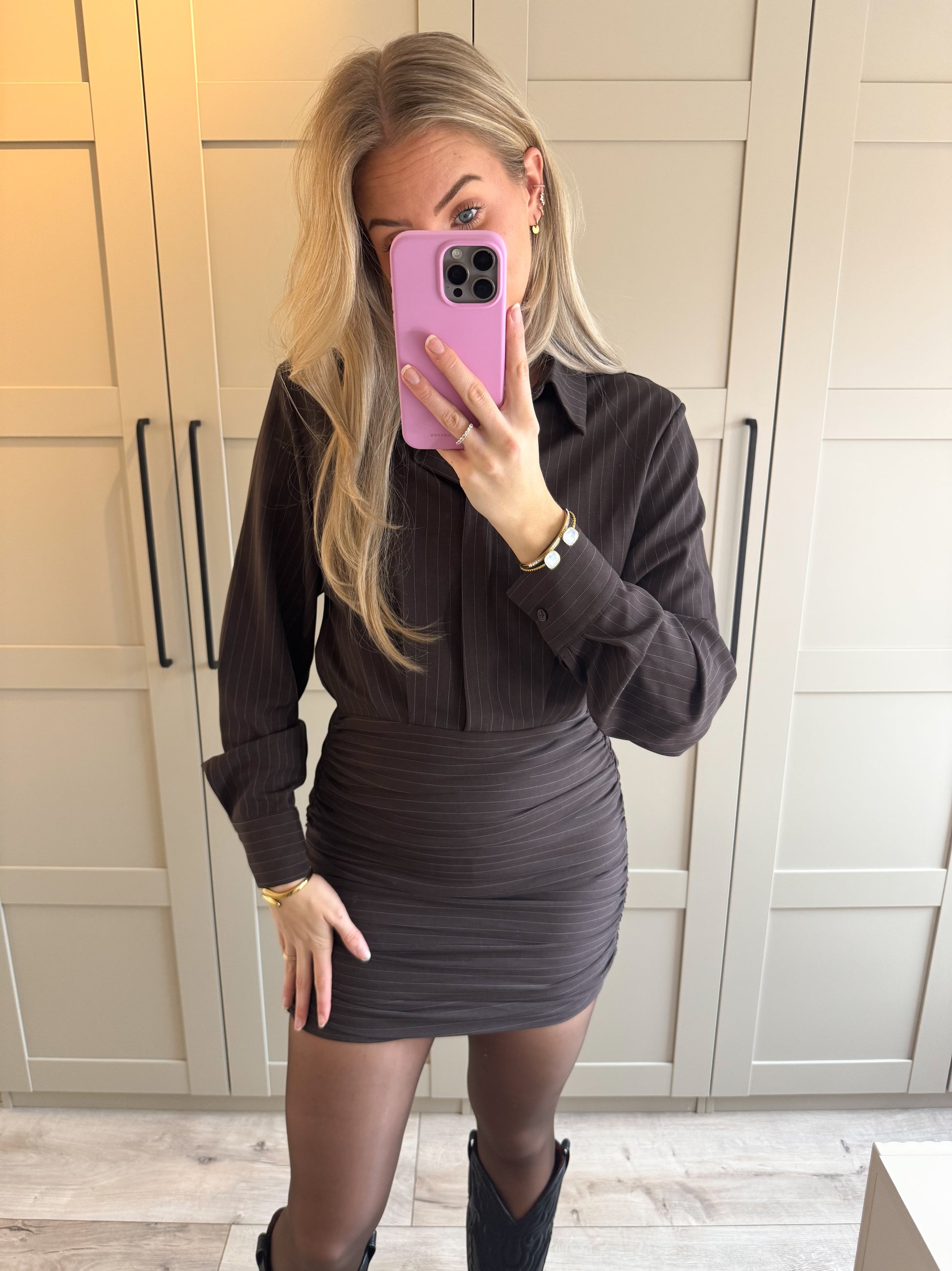 Deze jurk heeft een aansluitende fit aan de onderzijde en een blouse effect aan de bovenzijde. De jurk bevat lichte stretch.