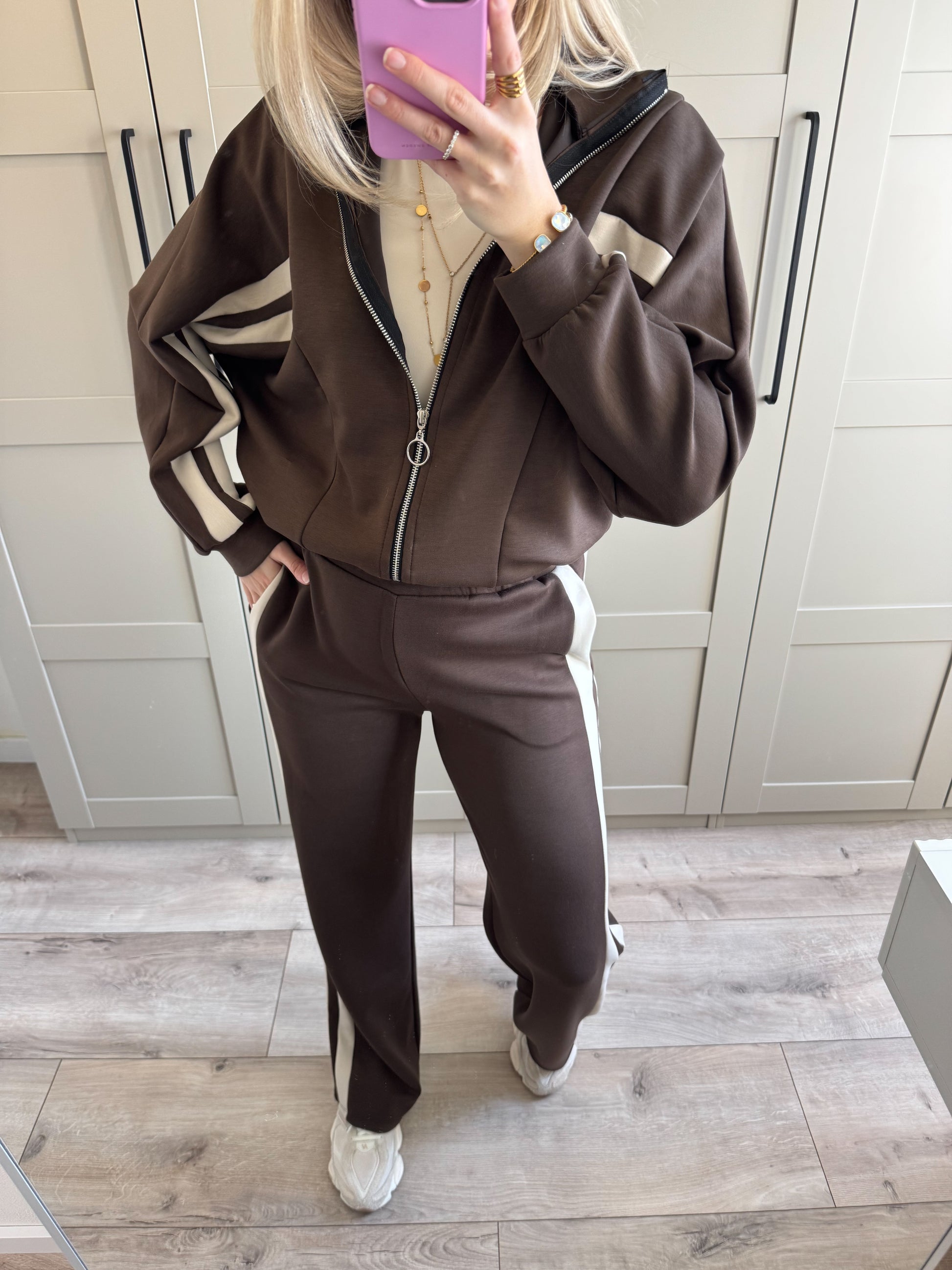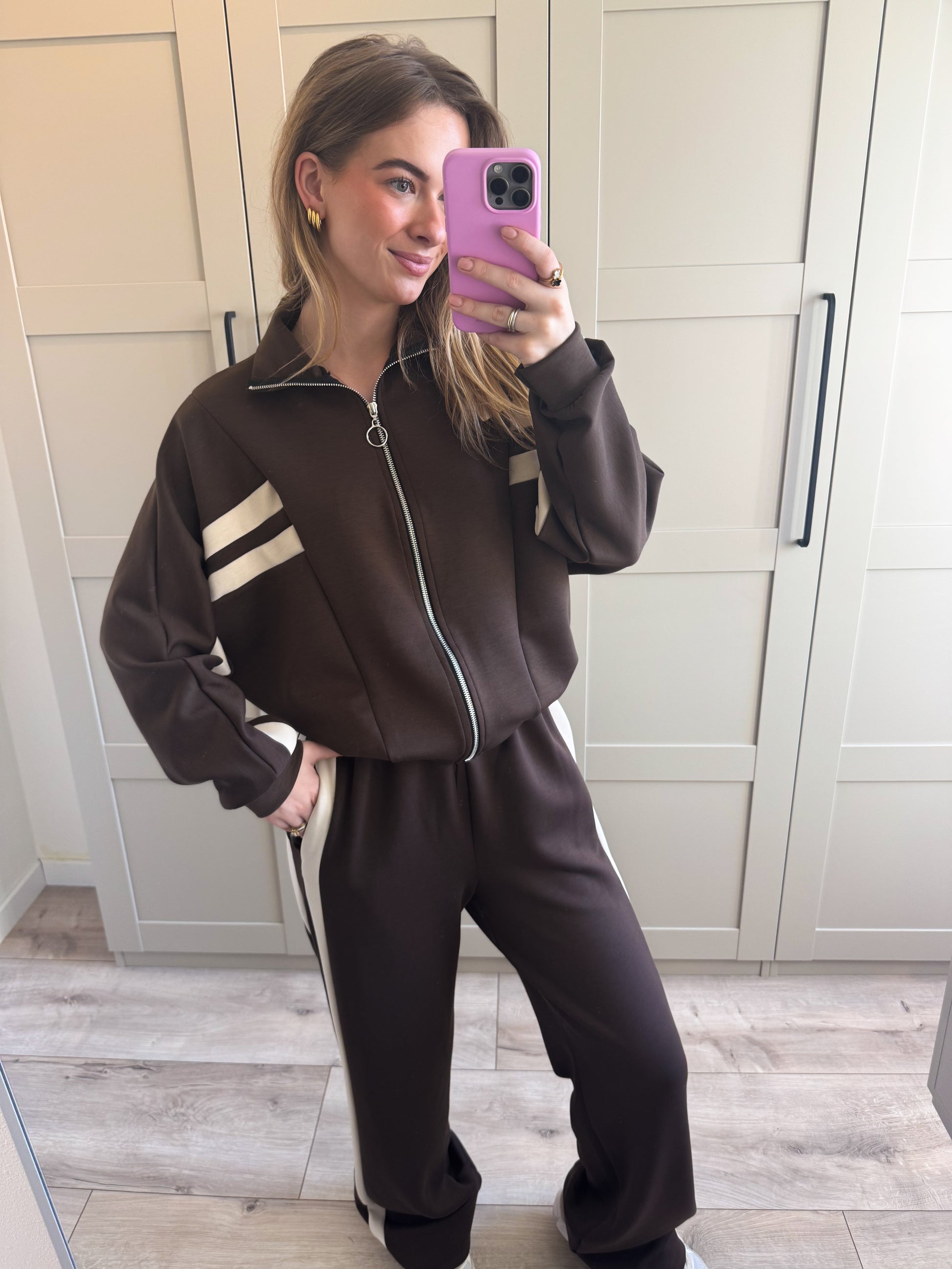Tweedelige set, oversized vest met rits en een straight leg broek. De stof bevat veel stretch!