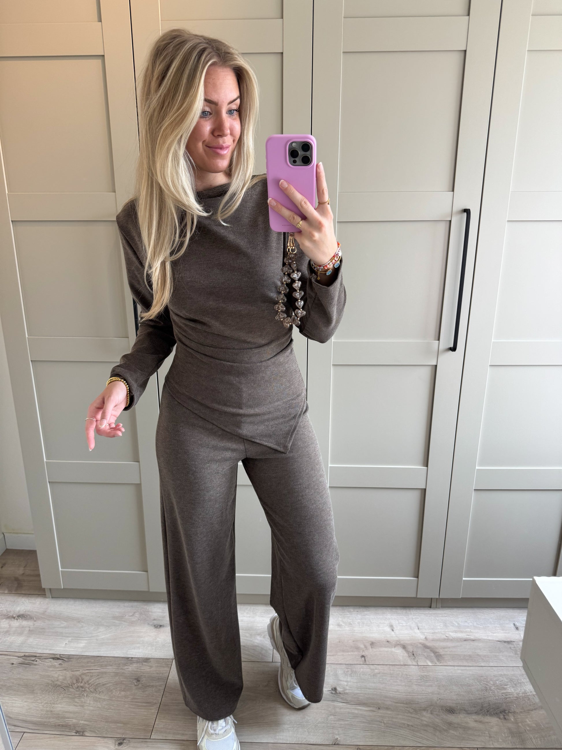 De stof bevat veel stretch en draagt heerlijk comfy maar ziet er alsnog leuk en netjes uit! De broek is wide leg en de top kan je normaal of off shoulder dragen.