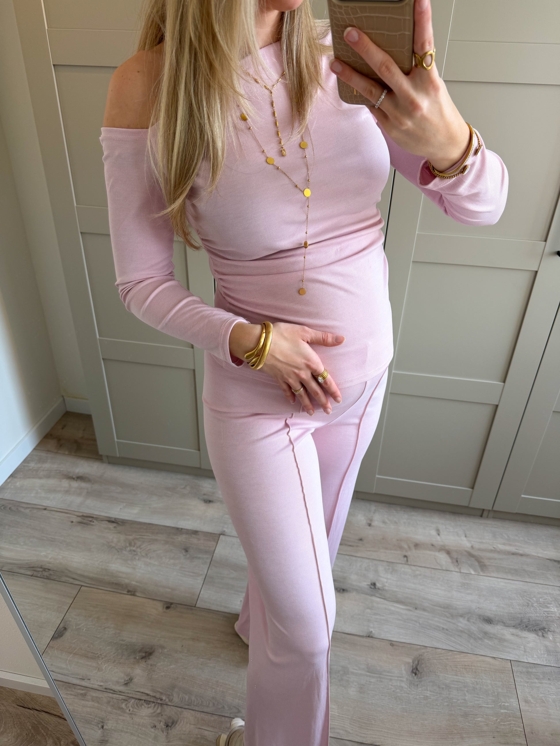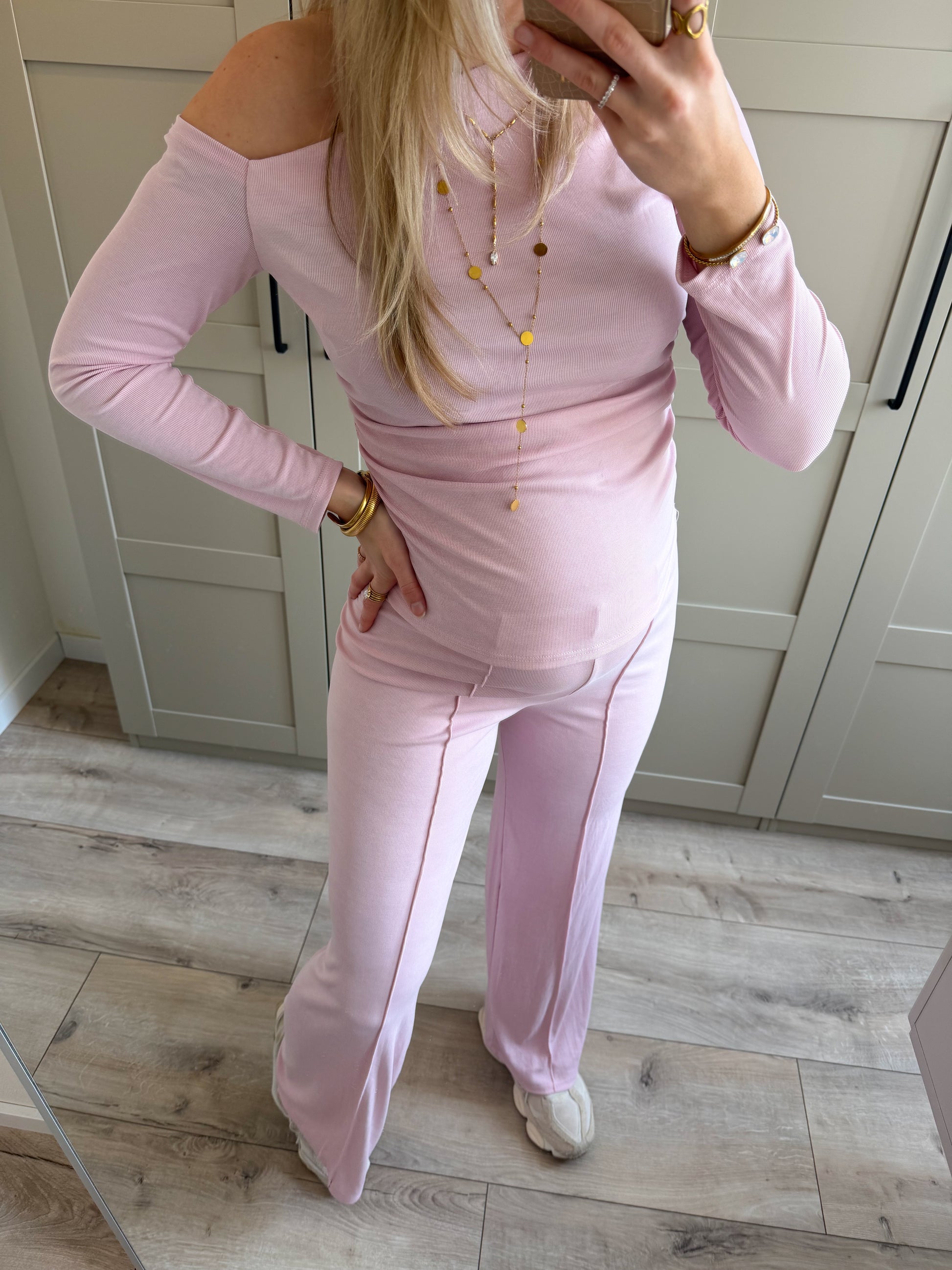 Tweedelige set van een dunnere stof, top off shoulder en een wide leg broek. De stof bevat veel stretch en is daardoor ook preggy proof te dragen!