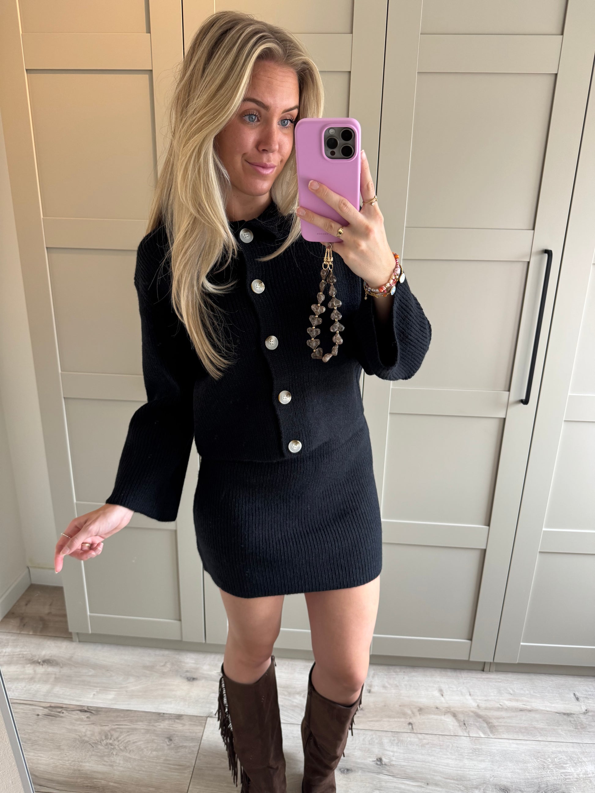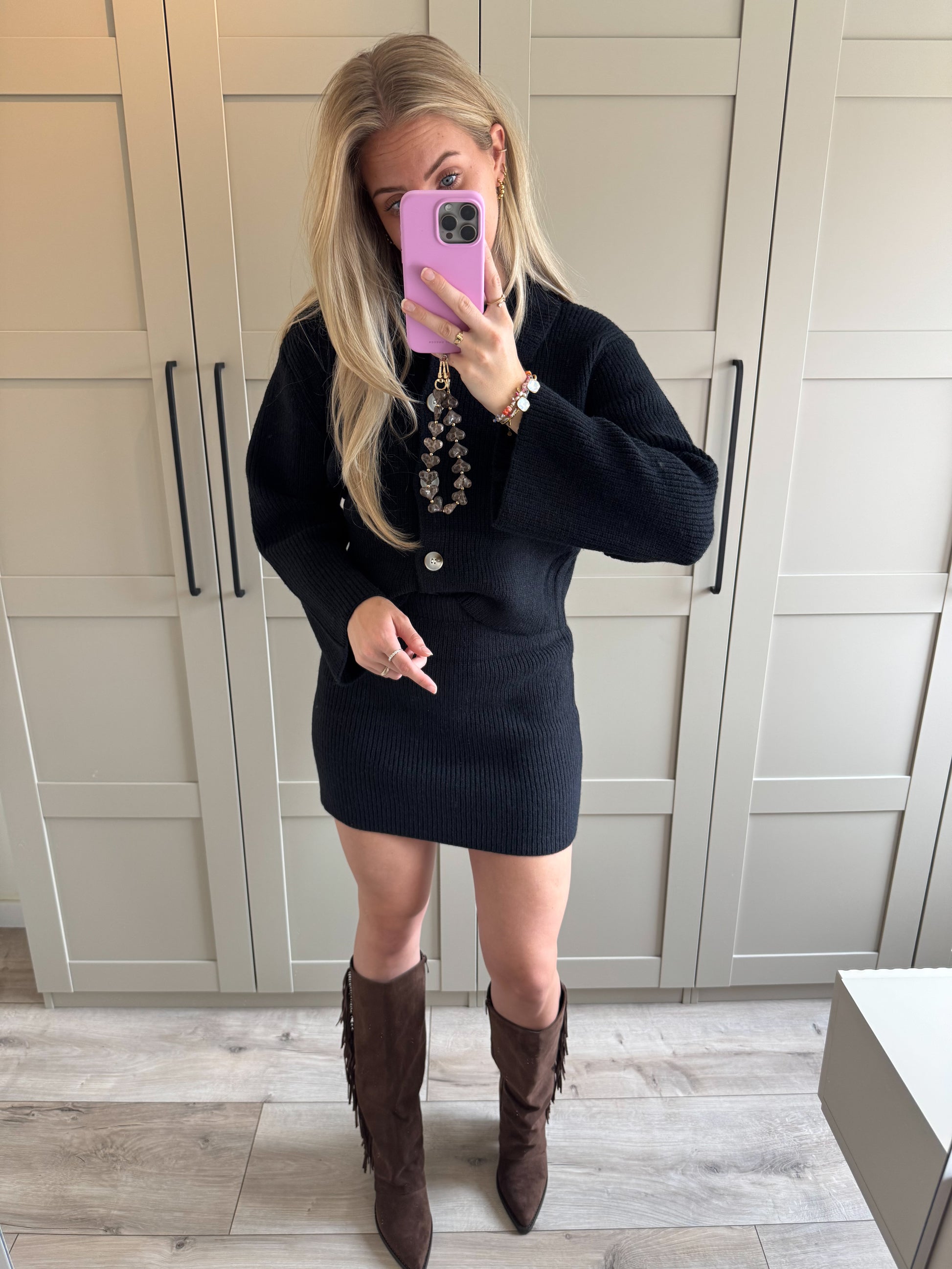 Deze tweedelige set bestaat uit een gebreid vest/trui en een rokje. Bevat veel stretch!
