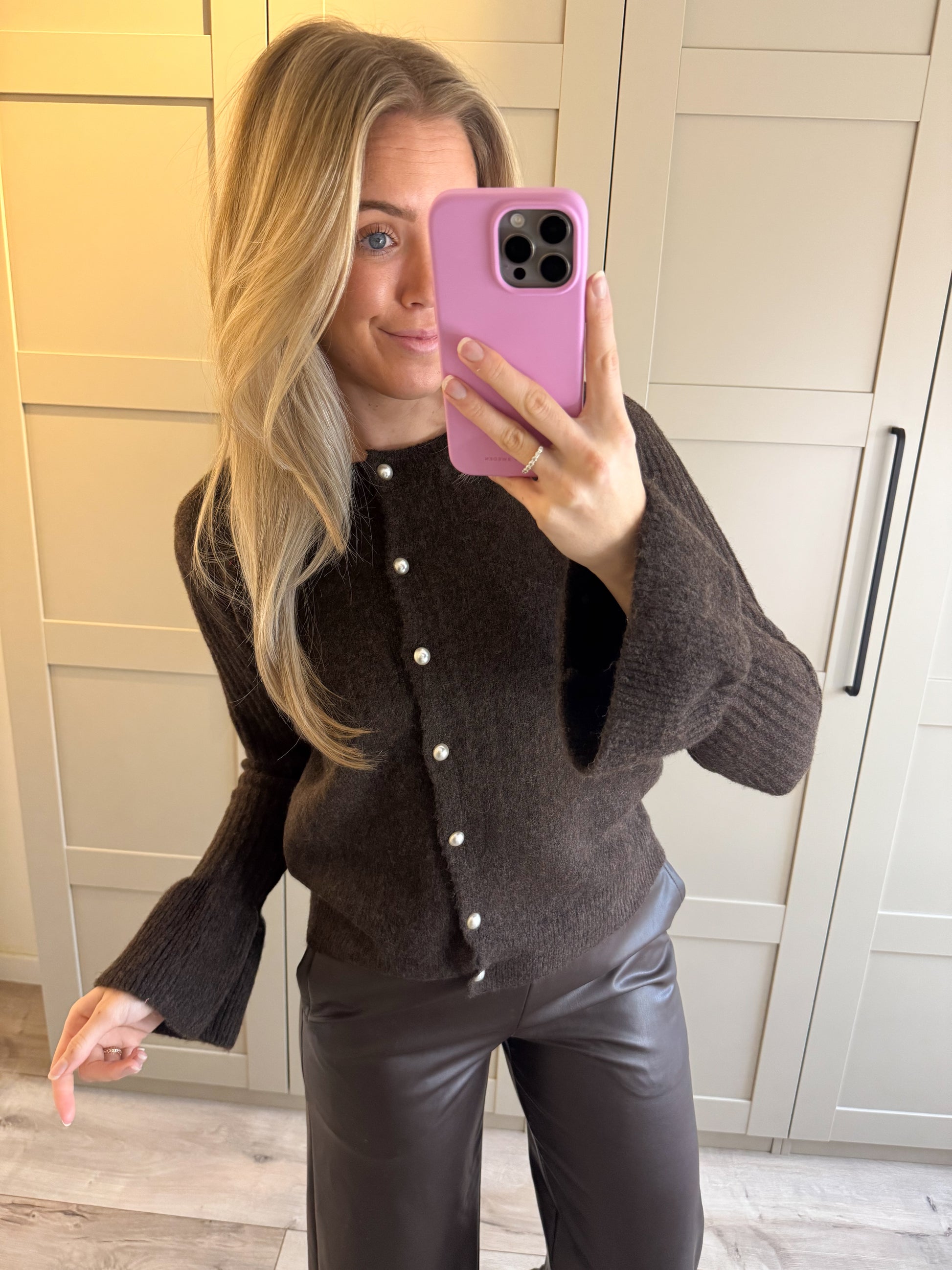 Vest Macey is zacht en fijn gebreid, heeft parel knoopjes als sluitingen en wijd uitlopende mouwen.