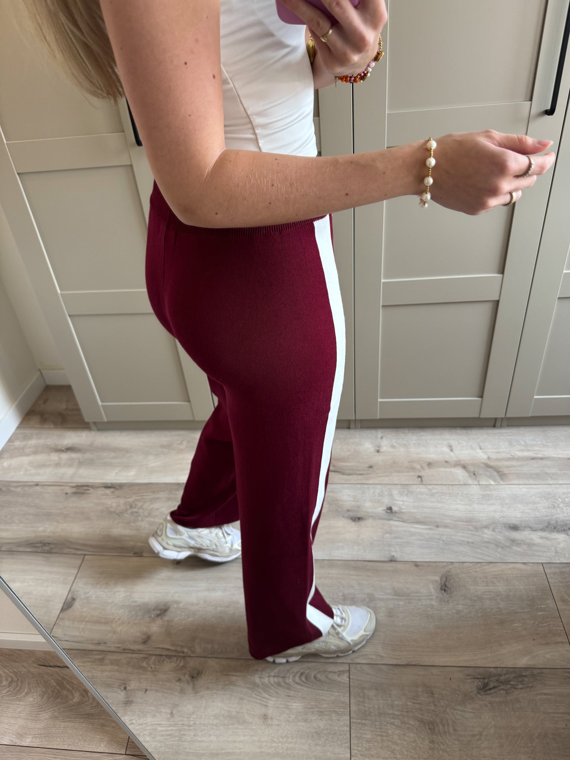 De broek is wide leg model, heeft een elastische tailleband en de stof bevat veel stretch. Aan de voorzijde zit een goudkleurig detail.